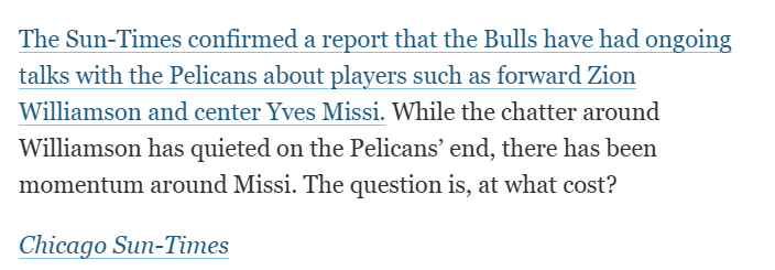 想要促成交易,鹈鹕队必须抱着摆烂的心态,将锡安与米西打包,换取公牛队一批合同即将到期的球员,例如中锋尼古拉-武切维奇、后卫科比-怀特以及前锋杰伦-史密斯。